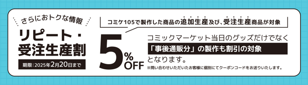 ★コミケ当日までにサンプル製作いただき、コミケで宣伝いただいた商品を受注生産する場合も割引の対象となります。
