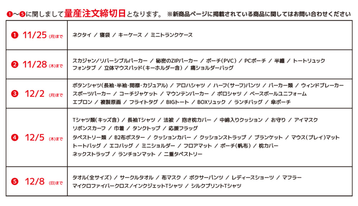期限:2024年 11月 28日(木)までに量産のご注文