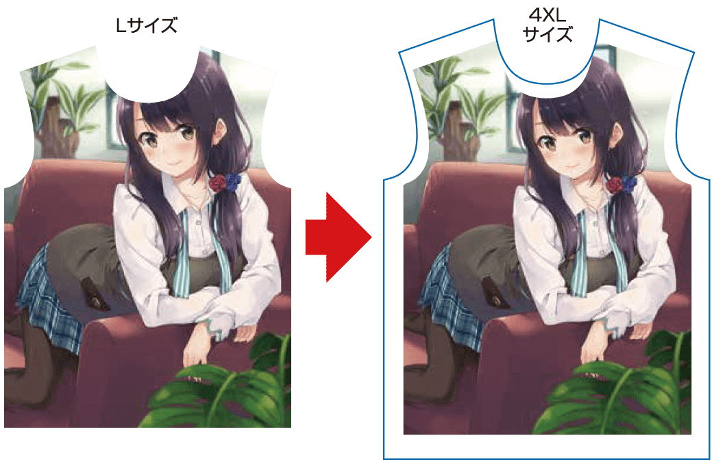 弊社のデザインテンプレートはLサイズを基準としています。2XL以上のサイズは裁断の形状が異なってくるためテンプレートにうまく当てはまらず弊社でデザインの調整を行っております。