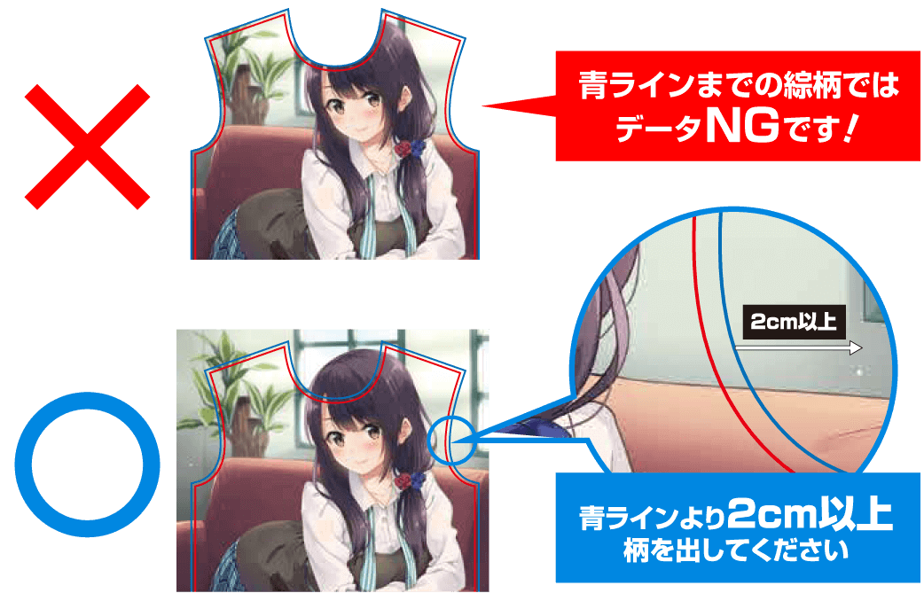 - 青ラインまで印刷データがある(2XL以上の場合はさらに2cm以上)