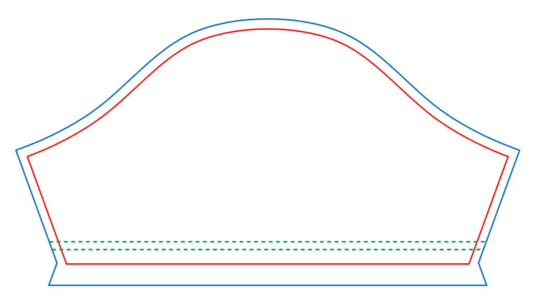 点線は縫製ライン、青ラインが裁断線、 赤ラインが縫い上がり線となります。デザインは必ず青ラインまで到達させてください。(2XL以上のサイズをオーダーされる場合は下記の指示に従ってください。)