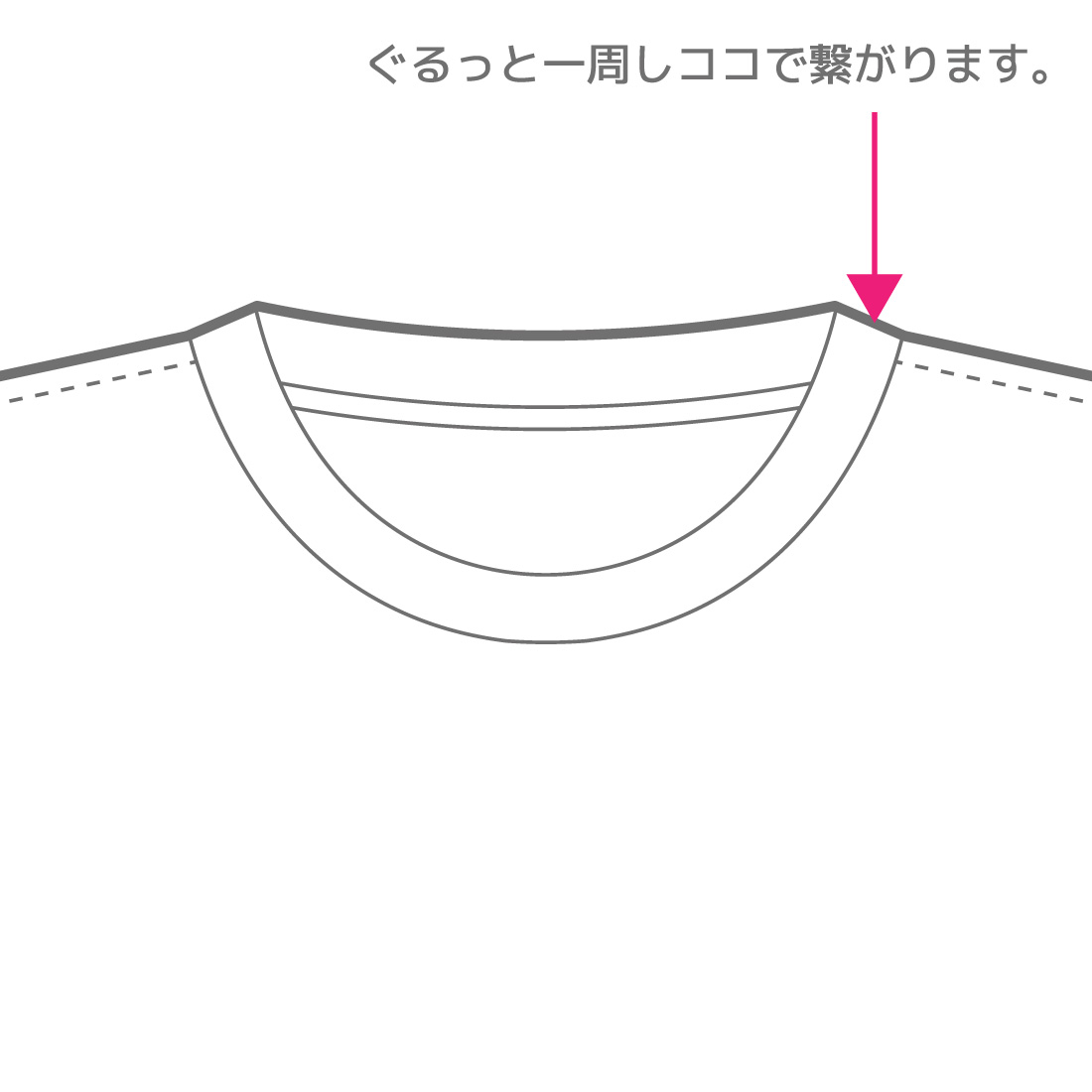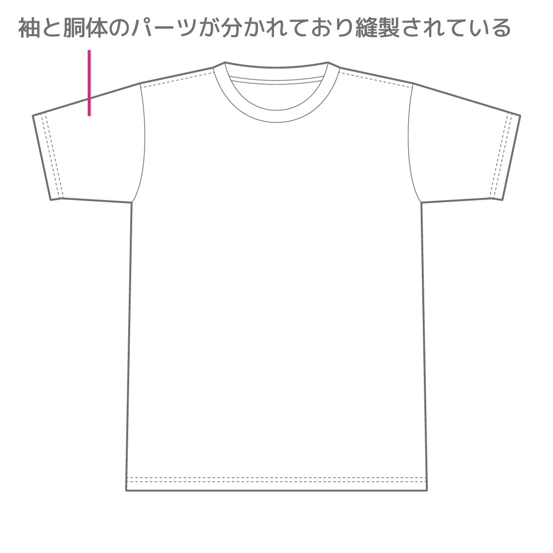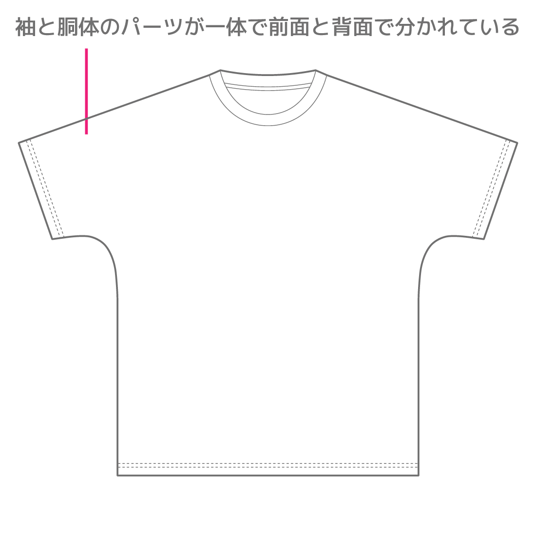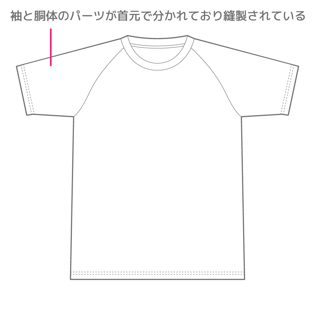 セットインスリーブと同様に表、裏、両袖、襟の5 パーツで構成されたT シャツ形状です。違いは、袖が首元にかけて切り替えが入っており、動きやすさも重視したタイプです。