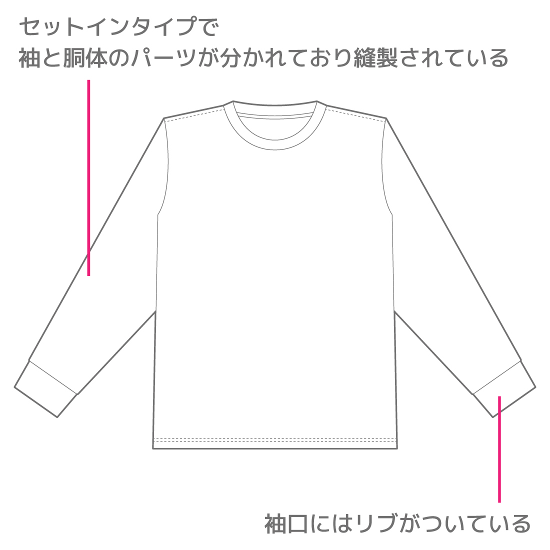 表、裏、両袖、襟の5 パーツに加え、袖のリブパーツもありしっかりとスリムな長袖T シャツ 。私服以外にもそのスリムな形状によりユニフォームとしても人気。