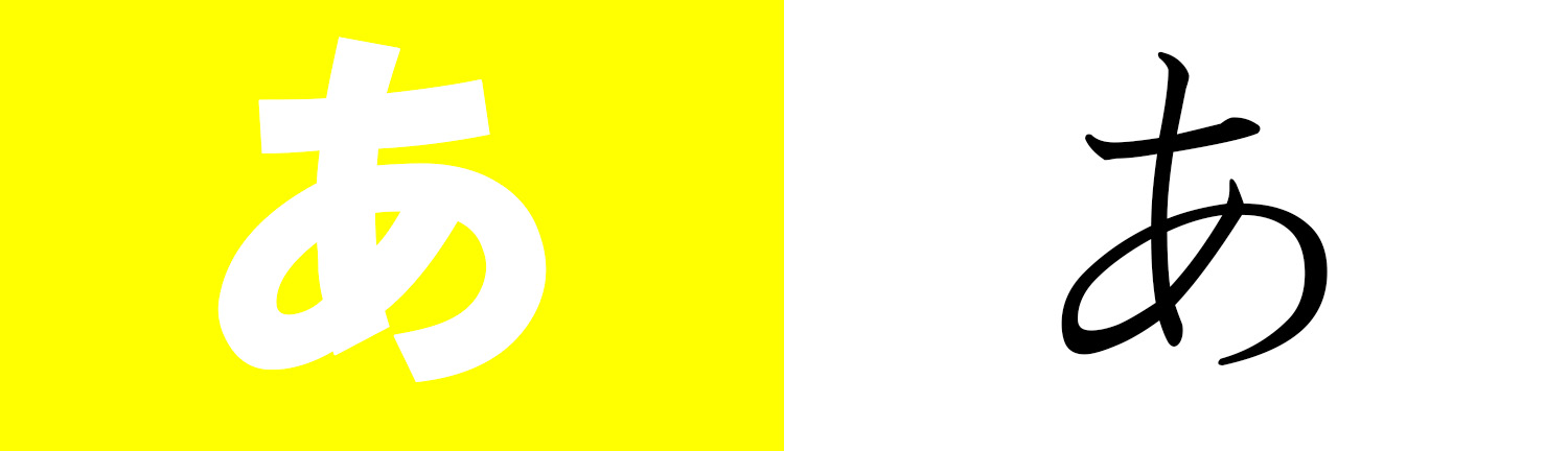 上の図の右の「あ」はゴシック体という太字の黒字の場合、生地の関係上、左の「あ」のように滲んで印刷されてしまうというケースもございます。そんな状況を避けるためにも、字体を細めのゴシック体に変更されるか白縁を付けることで滲みが緩和されます。