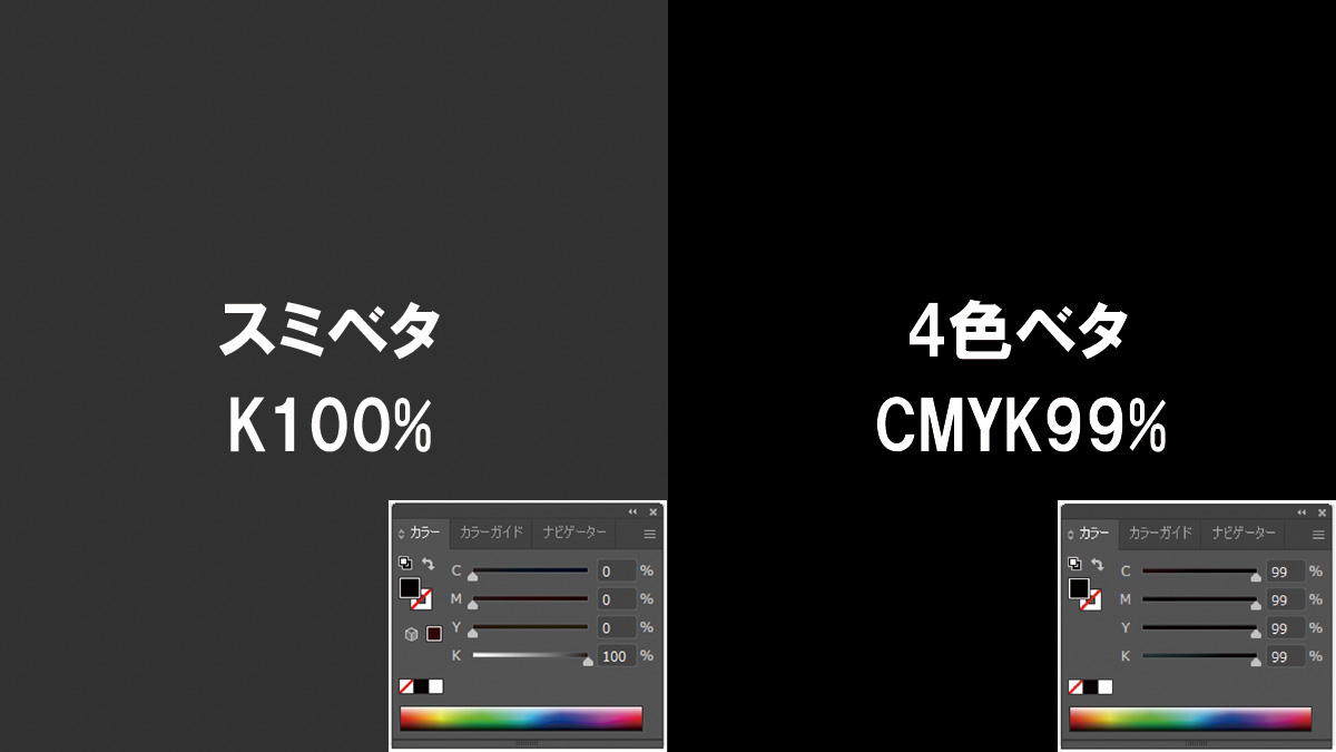 ですが、実際にプリントした結果、スミベタのK100より4色ベタのCMYK99の方が綺麗な黒が印刷されました。また、印刷機によっては、CMYK100の場合、印刷機がうまく認識しないということもあるらしいです。