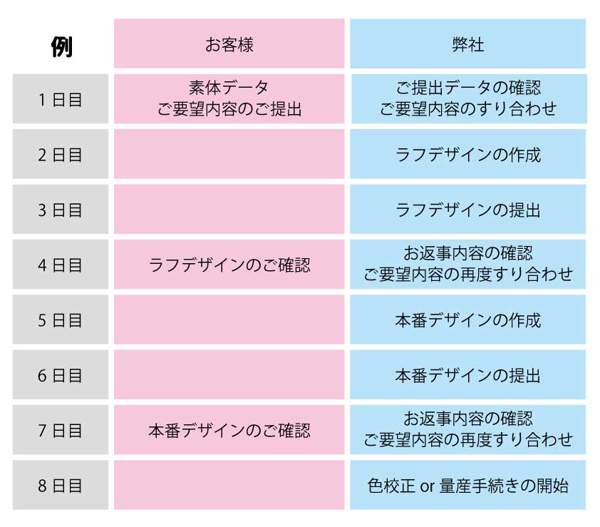 お客様のご希望に沿えるように右図のスケジュール例の流れでデザインを進行させていただきます状況によっては、スケジュール延びる可能性がございます。デザインが完成し、サンプル製作や量産への進行はホームページより商品のご注文をお願いいたします。