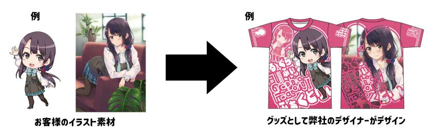 お客様にご用意いただいたイラストやデザインイメージを基にグッズをデザインいたします。