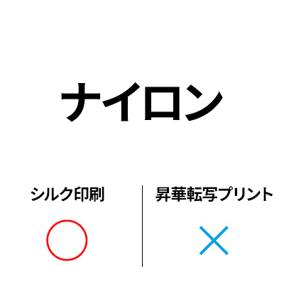 テカリがあるのが特徴の素材です。ブルゾンなどに使用されることが多い素材ですが、昇華転写プリントはできず、滑りやすい素材のためシルク印刷も難しい場合があるようです。最近ではナイロンに似た素材をポリエステルで作ることが可能で徐々にそちらに置き換わっているケースもあるようです。
