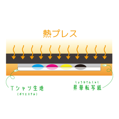 熱でプレスすることによって昇華転写紙に印刷したインクが液体から気体に気化します。蒸発・沸騰に近いイメージです。この際にポリエステルとの化学反応を起こし繊維が中からインクに染まります。インクが気化したことにより繊維の中に入り込めるのはポリエステルならではの反応です。